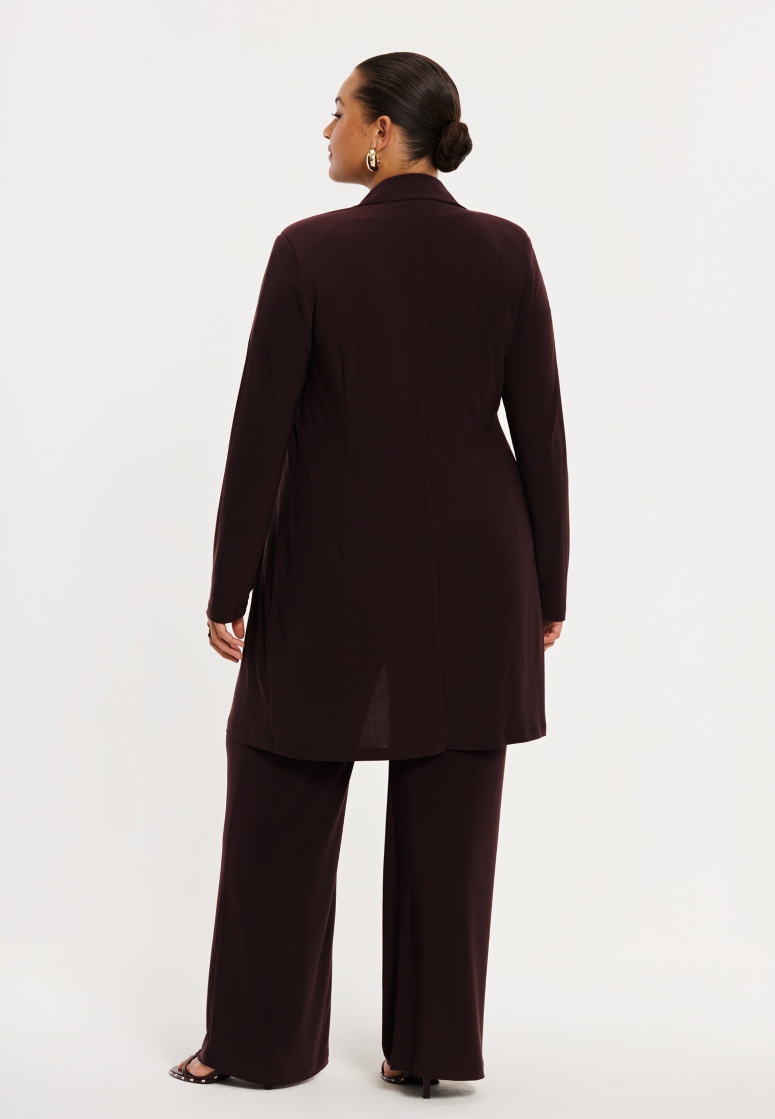 Oh, how we adore this beautiful warm burgundy shade! This long blazer is crafted from our recycled dolce fabric, features gold-coloured buttons and a refined lapel. Wear it chic as a co-ord look with the matching trousers.
