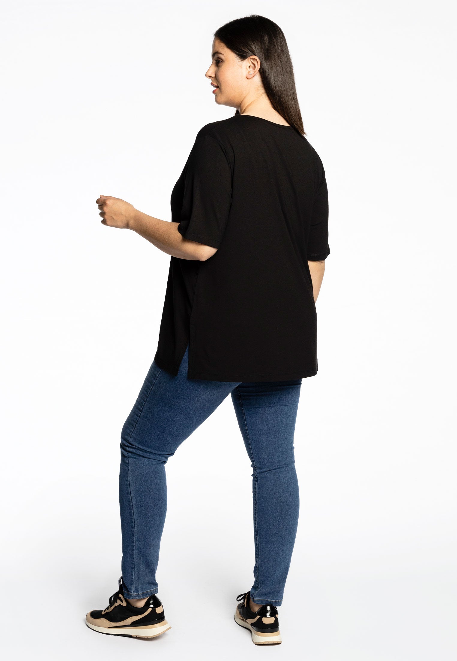 Basic jersey T-shirt with a scoop neck, short sleeves, two side slits and is A-line fitted.
