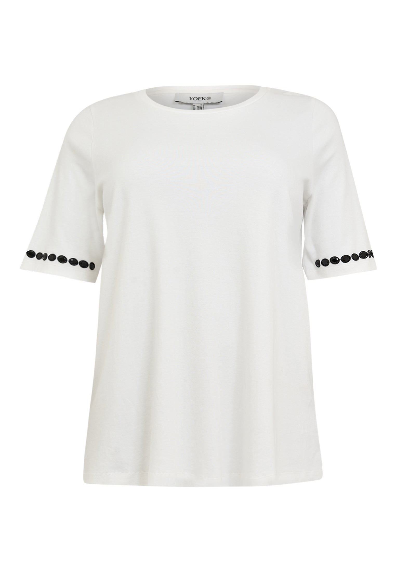 This fresh, white T-shirt is made from 100% soft cotton, offering a wonderfully comfortable feel against the skin. Its relaxed silhouette makes it light, breathable and easy to wear. The real eye-catcher? The shiny black stones along the sleeves, adding a subtle, trendy touch to this timeless basic. Perfect to pair with a blazer, jeans or your favourite suit. Whatever the look, this tee brings a chic yet casual vibe to any outfi!