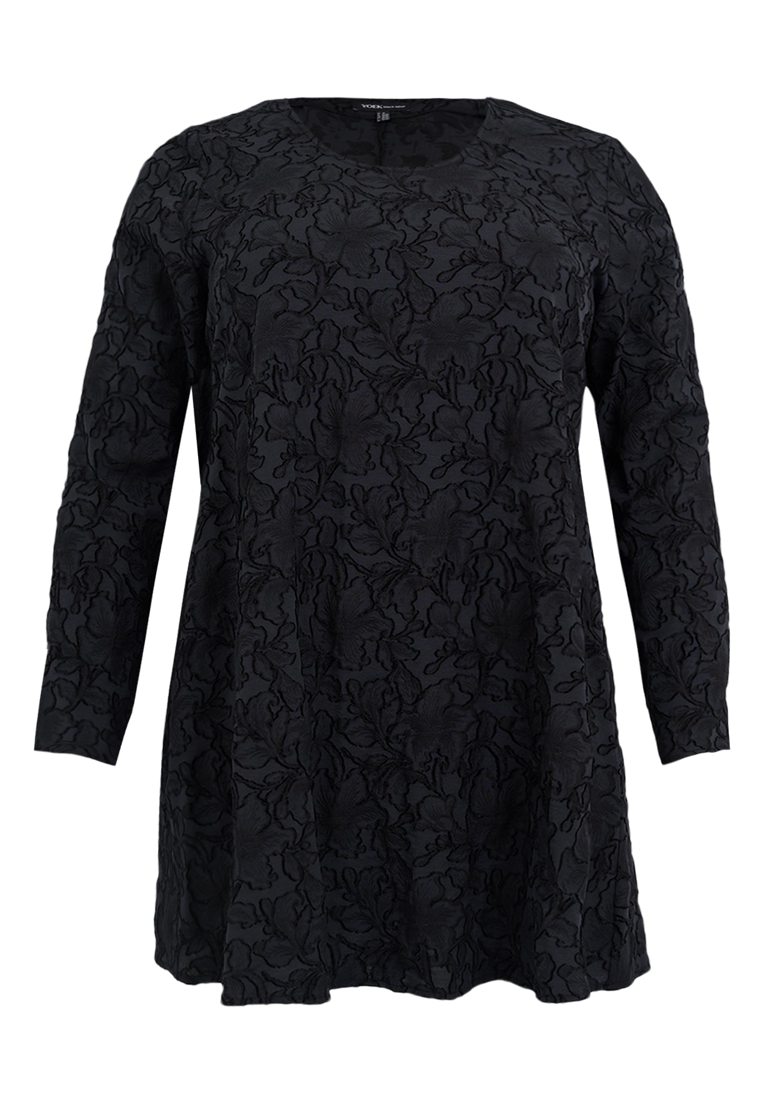 This tunic is crafted from a rich jacquard fabric with a beautiful floral texture. The luxurious black design features the signature YOEK wide-bottom fit. An ideal choice for an evening out or a cosy dinner! Pair the tunic with your favourite black trousers and your best jewellery, and you’re ready to go in no time.